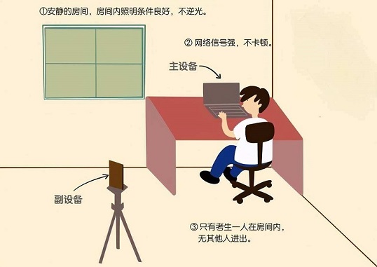 3. 麵試采用騰訊會(hui) 議軟件,請應聘人員提前安裝好軟件,並完成注冊(ce) 。同時,為(wei) 保證麵試公平,采用雙機位方式麵試。麵試房間內(nei) 除應聘人員本人外,不能有其他任何人員。請應聘人員準備好兩(liang) 個(ge) 帶高清視頻功能的電子設備,其中一個(ge) 置於(yu) 應聘人員正前方1米左右位置,另一個(ge) 置於(yu) 應聘人員斜後方1.5米左右位置。參考下圖: